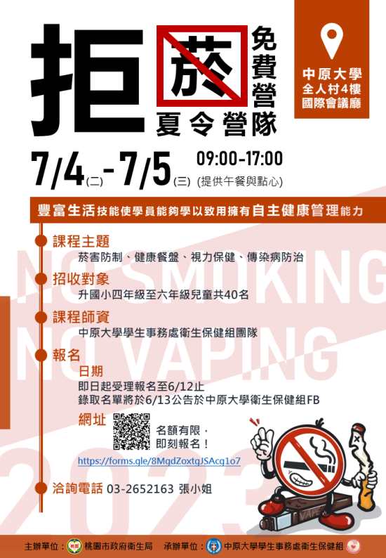 主旨: 有關本府衛生局委託中原大學辦理「112 年拒菸夏令營」,將於 112 年 6 月 12 日報名截止,請貴校轉知學生並鼓勵踴躍參與,請查照。