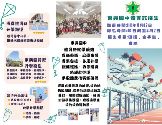 主旨: 檢送本校114 學年度體育班第新生入學(含轉學、轉班生)甄選簡章,敬請惠允協助公告周知,並請鼓勵所屬學生踴躍報名,請查照。
