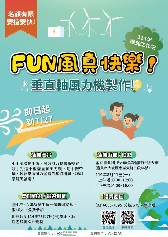 主旨: 有關經濟部能源署舉辦 114 年度「FUN 風真快樂!綠能工作坊-垂直軸風機製作」活動一案,詳如說明,請查照。