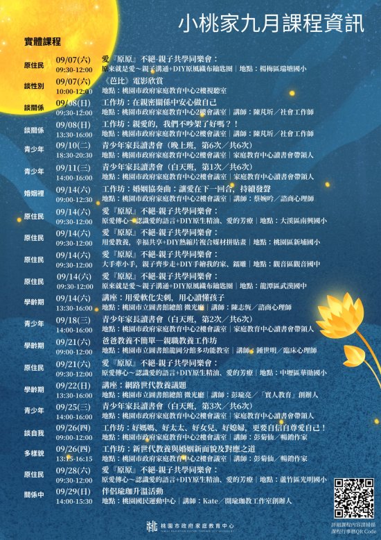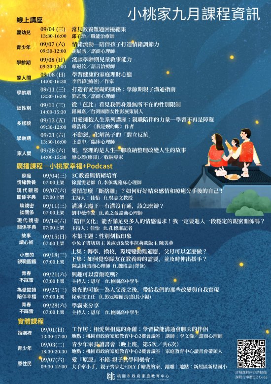 二、 旨揭課程詳細資訊,請見中心課程行事曆( https://reurl.cc/xlGyGL )或追蹤「桃園市政府家庭教育中心」FB 粉絲專頁;另倘有家庭教育個別化服務需求,可撥打 4128185 諮詢專線或申請小桃家線上諮詢室( https://reurl.cc/oZWOY5 )服務。