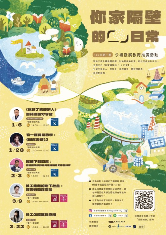 一、 本館於明(113)年 1 月至 3 月辦理主題系列講座,將聚焦三項永續發展目標: SDG8 就業與經濟成長、 SDG10 消弭不平等、 SDG16 制度的正義與和平,討論超高齡社會及移工勞力現況,帶領社會大眾了解何為聯合國永續發展(SDGs)目標,教育民眾以自身出發,響應永續發展計畫。